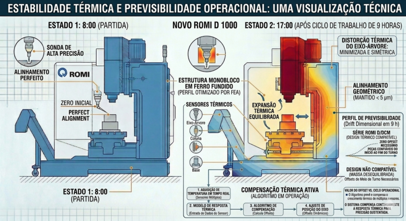 A ROMI enfrenta esse desafio por meio de um projeto termicamente compatível. Ao garantir que a massa estrutural seja equilibrada e ao utilizar sistemas de refrigeração de alta precisão quando necessário, as máquinas ROMI D e DCM mantêm o alinhamento geométrico ao longo de ciclos prolongados de produção. Essa previsibilidade operacional significa menos tempo gasto com compensações e mais tempo produzindo peças boas.